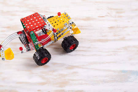 Child metal constructor road roller for mechanical assembly education isolated on the black background