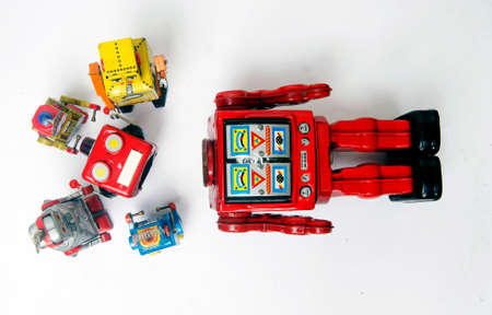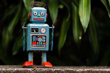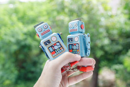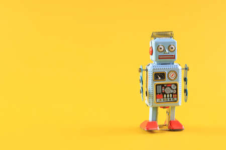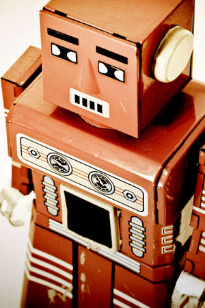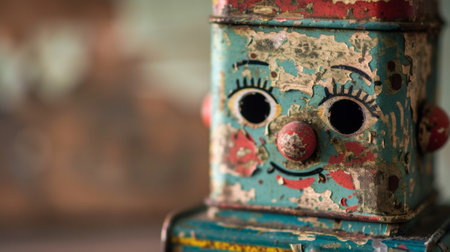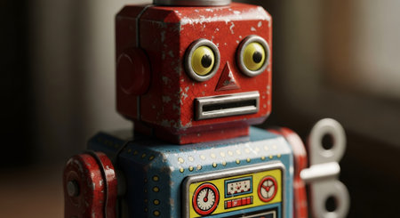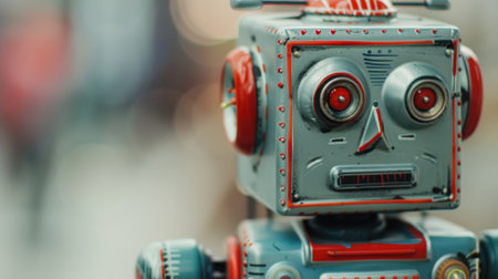 Close up of a vintage red and blue tin toy robot with yellow eyes. Classic retro wind-up toy for child play and childhood nostalgia.