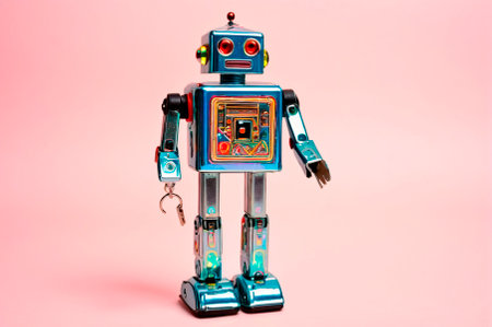 A charming vintage robot toy with dials and buttons displays a colorful exterior on a bright backdrop.