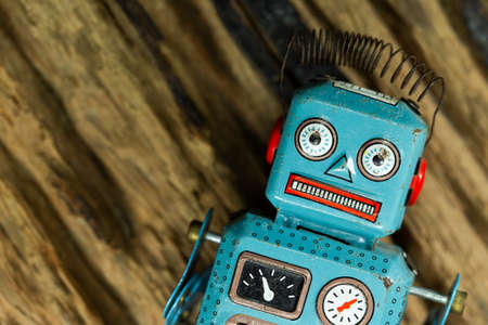 Vintage tin robot toy on wooden table in workshop, retro toned