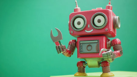 A charming vintage robot toy holding a wrench, set against a vibrant green background. Perfect for creative projects, themes of technology and play.