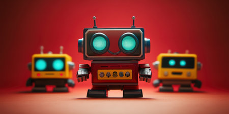 Three playful robotic toys stand prominently in a bright environment, featuring glowing eyes and charming designs. Their vibrant colors contrast with the background, capturing attention and wonder.