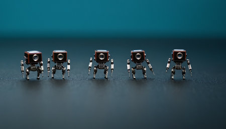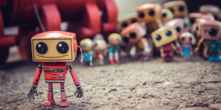 A toy robot standing in front of a bunch of other toy robots. Generative AI image.