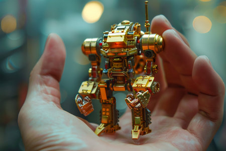 Innovative design shrinks to palm-size with this intricate miniature mech robot toy, 3d,robotic,dreamy gold,bokeh