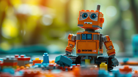 A small orange toy robot stands out amidst scattered colorful building blocks, symbolizing learning and creativity in play.