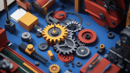 This vibrant 3D isometric illustration showcases an intricate arrangement of colorful gears and cogs, perfect for representing engineering and design themes.