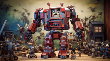 A bunch of action steampunk figures on top of a wooden table. AI generative image.