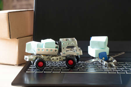 Shipping, delivery and logistics concept. Truck and plane and cardboard boxes on laptop keyboard. online technologies. Online delivery of goods, courier service, Online store