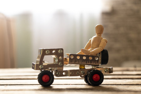 Miniature people of worker loading thing to submarine on wood table with nature background. Selective focus