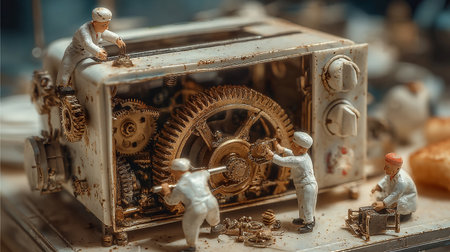 concept technical support; woth a team of vintage robots fixing the big robots head