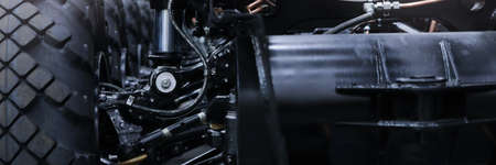 Exploring the Robust Car and Truck Backbone: A Glimpse of Chassis Equipment, Elements, Devices, and Parts Including a View into the Vehicle's Back Cabin and Pneumatic Hoses, Alongside Sturdy Metal Steps for Convenient Maintenance