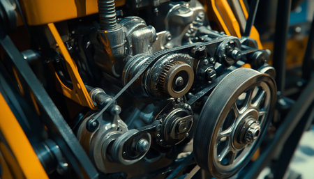 Detailed close up of an engine featuring a pulley and belt system at the motor show display