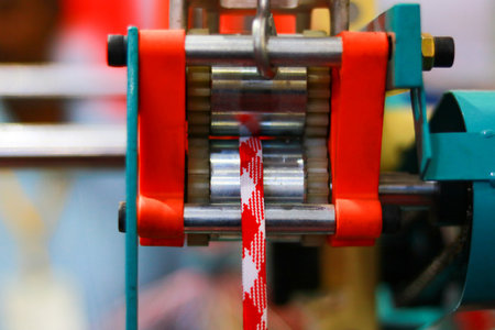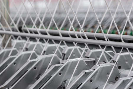 Multicolored straight strands texture background, sewing equipment, loom equipment at a garment factory