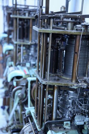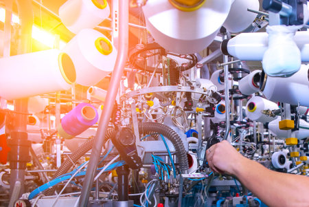 Lots of dust from threads. Image of sock knitting machine in operation. Machinery and equipment in textile production
