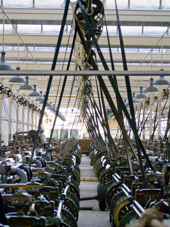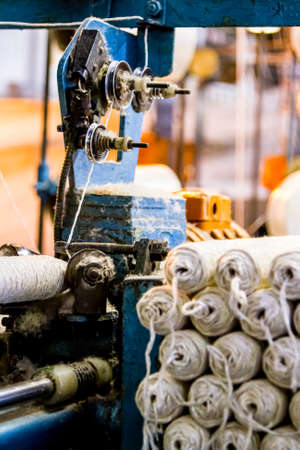 Machinery and equipment in the workshop for the production of thread, close-up. interior of industrial textile factory