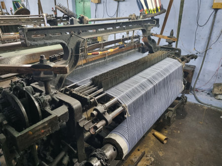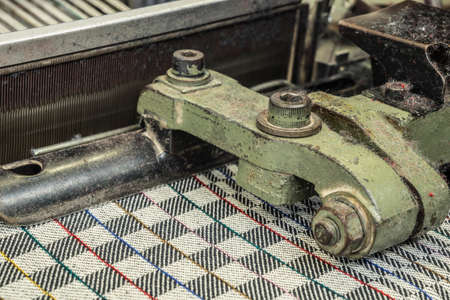 Johannesburg, South Africa - October 16, 2012: Close up of a cotton thread weft loom machine in a conveyor belt factory