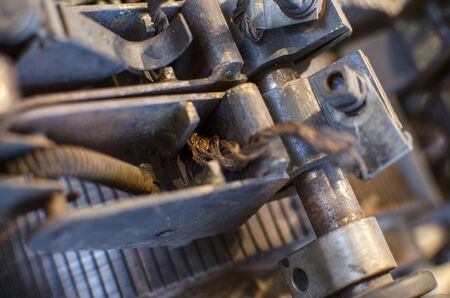 Old machinery close-up. Retro style mechanism, gear, metal cogwheels, nuts and bolts