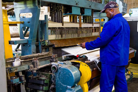 Johannesburg, South Africa - October 16, 2012: African factory worker operating a cotton thread weft loom machine