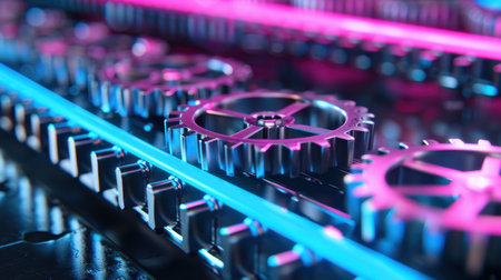 This high-tech image features intricate gears illuminated by vibrant neon lights. The futuristic design highlights precision engineering in an industrial setting.