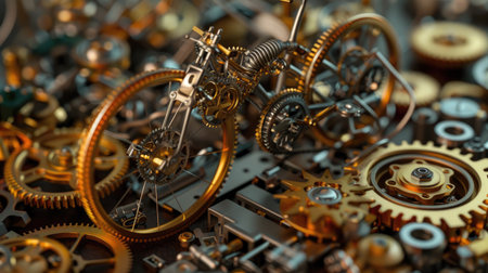 Intricate mechanical gears and clockwork components are displayed shining metallic surfaces and glowing highlights exemplifying futuristic engineering artistry and design.
