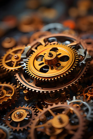 Mechanical parts close-up An intricate close-up of interlocking gears and cogs in motion, their polished metallic surfaces gleaming under soft golden light. Every