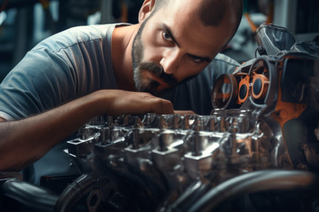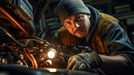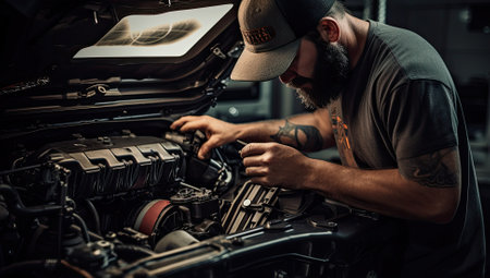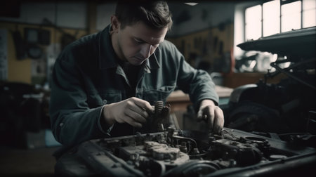 A focused mechanic works on a car engine in an automotive workshop, emphasizing skill, precision, and mechanical expertise. High quality photo