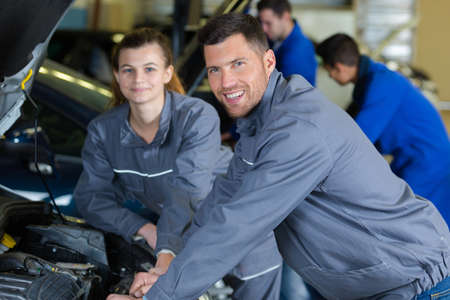 young male and female mechanics posing