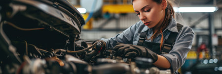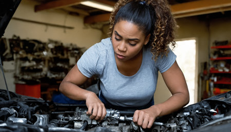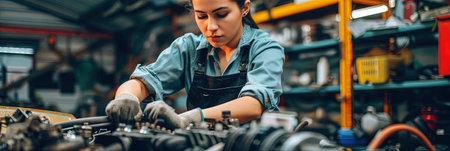 A woman mechanic demonstrates skill and dedication while working on an engine in a well-lit workshop, showcasing her tools and focus on the repair process.
