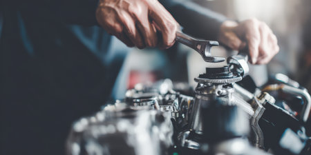 Auto mechanic hands using a wrench to service and repair a car engine in a garage workshop, close-up on tools, bolts and skilled maintenance work on vehicle components