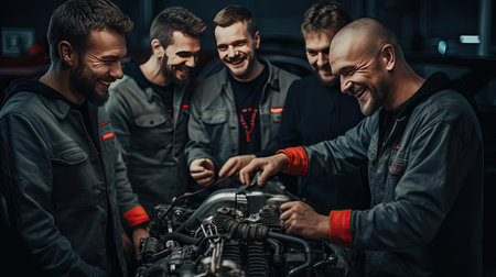 Car mechanic working on a car engine in a garage. Auto service industry. Generative AI
