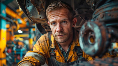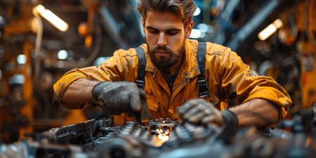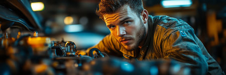 Determined and precise, a seasoned car mechanic works attentively on a vehicle engine, the workshop's warm lighting emphasizing his dedication and technical expertise, banner