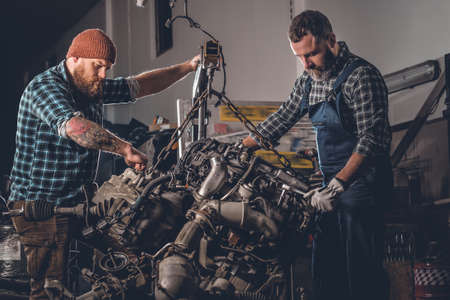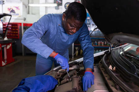 Auto mechanic working and repair on car engine in mechanics garage