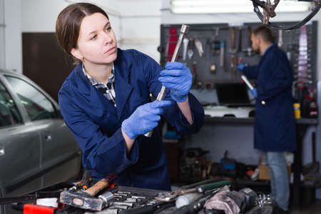 Woman auto mechanic repairs with a wrench with an engine