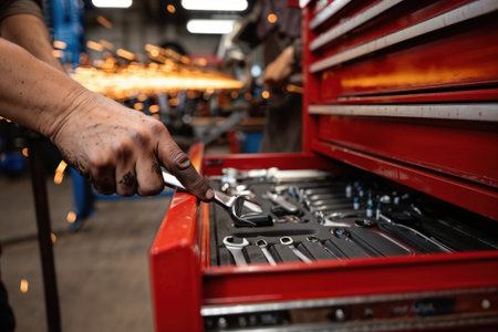 A mechanic's dirty hand reaches for a wrench from a red tool chest in a busy workshop.