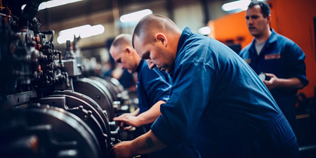 Workers inspecting and maintaining machinery in an industrial maintenance workshop