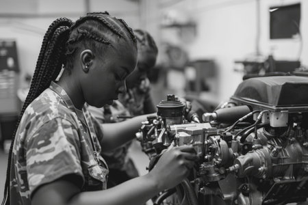 A woman with intricately braided hair intently works on an engine, her focused expression highlighting her dedication to her craft.