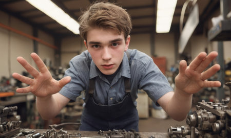 Young apprentice demonstrating precision and expertise in a mechanical workshop, highlighting skilled trades and vocational training