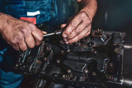 The auto mechanic deconstructs the internal combustion engine. Repair service