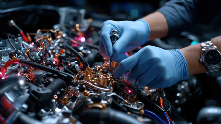 Experience the artistry of automotive repair with a close-up of a mechanic's hands engaged in the intricate work of sorting out a vehicle's motor. Discover the technical expertise and skill required for such precision repair.