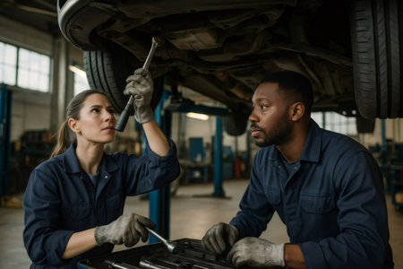 Two auto mechanics collaborating, inspecting and repairing a vehicle lifted on a hydraulic ramp in a professional workshop