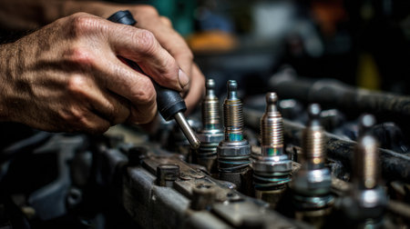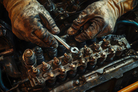 A mechanic is working on a car engine, using a wrench to remove the spark plugs. The engine is old and dirty, and the mechanic is wearing gloves to protect his hands from the grease and grime