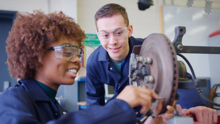 Male And Female Students Working On Car Brakes On Auto Mechanic Apprenticeship Course At College