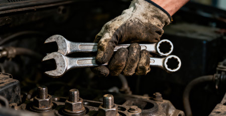 A close-up image of a mechanic's gloved hand holding a spanner tool, symbolizing precision and craftsmanship in a workshop environment. Ideal for themes of repair, maintenance, and engineering.