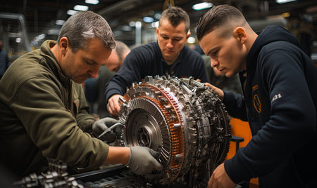 A team of engineers, wearing safety gear, diligently inspecting and repairing a large engine in a factory setting.