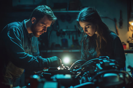 A man and a woman collaborate to repair a motorcycle's engine under soft lighting in a workshop.