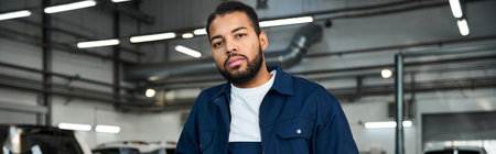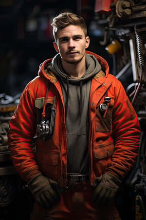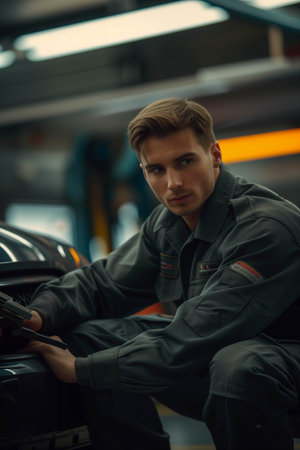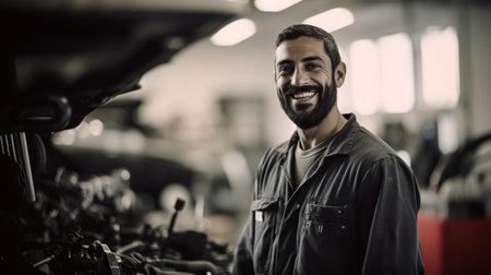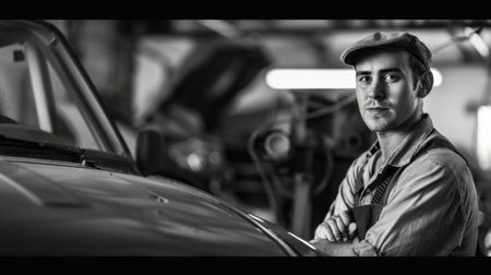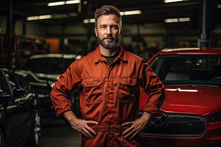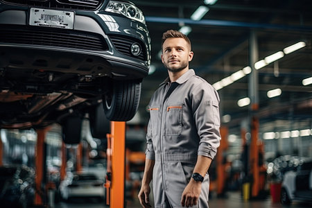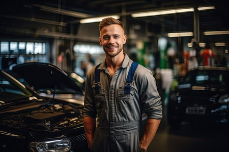 Standing poised next to an open car hood, a skilled male mechanic exudes expertise in a clean, organized garage with state-of-the-art equipment and precise tools