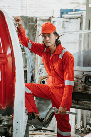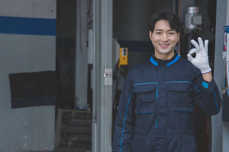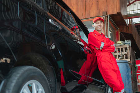 Man repairing a car in auto repair shop. Serious young Asian man standing in his car repair workshop and looking at camera.