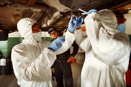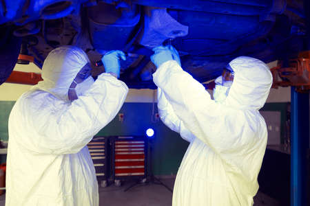 Crime investigation - collecting of evidences and traces from chassis of suspected car in police garage under UV light