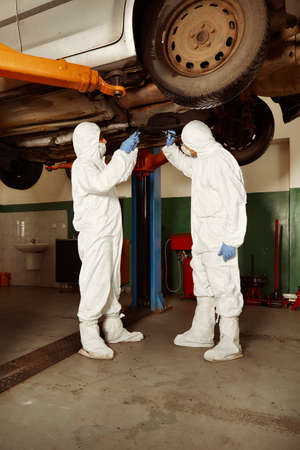 Crime investigation - inspection of suspected car in police garage - chassis observing