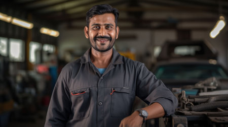 Happy Indian auto mechanic in overalls repairing cars at service center. High quality photo